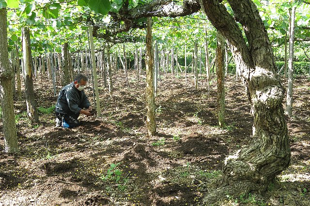 園地の環境は、個々の条件で色んな場所がある。ここ佐城多久地区のKさんの園地では、水源が遠くて灌水施設が厳しい。その対応として土壌乾燥を抑える為に完熟堆肥を毎年施用し膨軟土壌化を図られている。樹齢に対し樹勢の安定が窺える。凄いの一語なり。Kaji