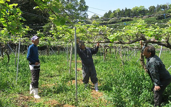 View large キウイフルーツ 準備は! 2024年4月10日 水曜日 気象変化が大きい中で停滞気味だった生育も順調に回復進行なり。県内で生育が一番早い有明海岸地帯の大浦地区では、萌芽展葉も揃っており、すでに花芽の先端が綻び白い物が散見できる状態に。来週にも開花の走りが予想されるなり。花粉や交配器具の準備点検など早めの準備に取り掛かって下さい。「光陰矢の如し」です。「覆水盆に返らず」を体験しない様に Kaji Previous 風光る! Next 時進む! Related postsMore detailsキウイフルーツぐっすり! 2025年2月8日(土曜日) at 11:29 AM by kaji キウイフルーツなど落葉果樹では休眠が有り、休眠には自発休眠と...More detailsキウイフルーツ確認! 2025年2月7日(金曜日) at 2:16 PM by kaji ゼスプリ防除指針日本産キウイフルーツ2025の提示を受けて、...More detailsキウイフルーツ負けてない! 2025年1月30日(木曜日) at 5:48 PM by kaji 早やくも年明け一か月、現場では剪定から誘引作業に進行中なり。...More detailsキウイフルーツ気持ち新たに! 2025年1月7日(火曜日) at 5:49 PM by kaji 年も明け、心新たに剪定作業に邁進なり。年末からと明けてからの...More detailsキウイフルーツ謹賀新年! 2025年1月1日(水曜日) at 7:58 AM by kaji 明けましておめでとうございます。今年も宜しくお願いいたします...